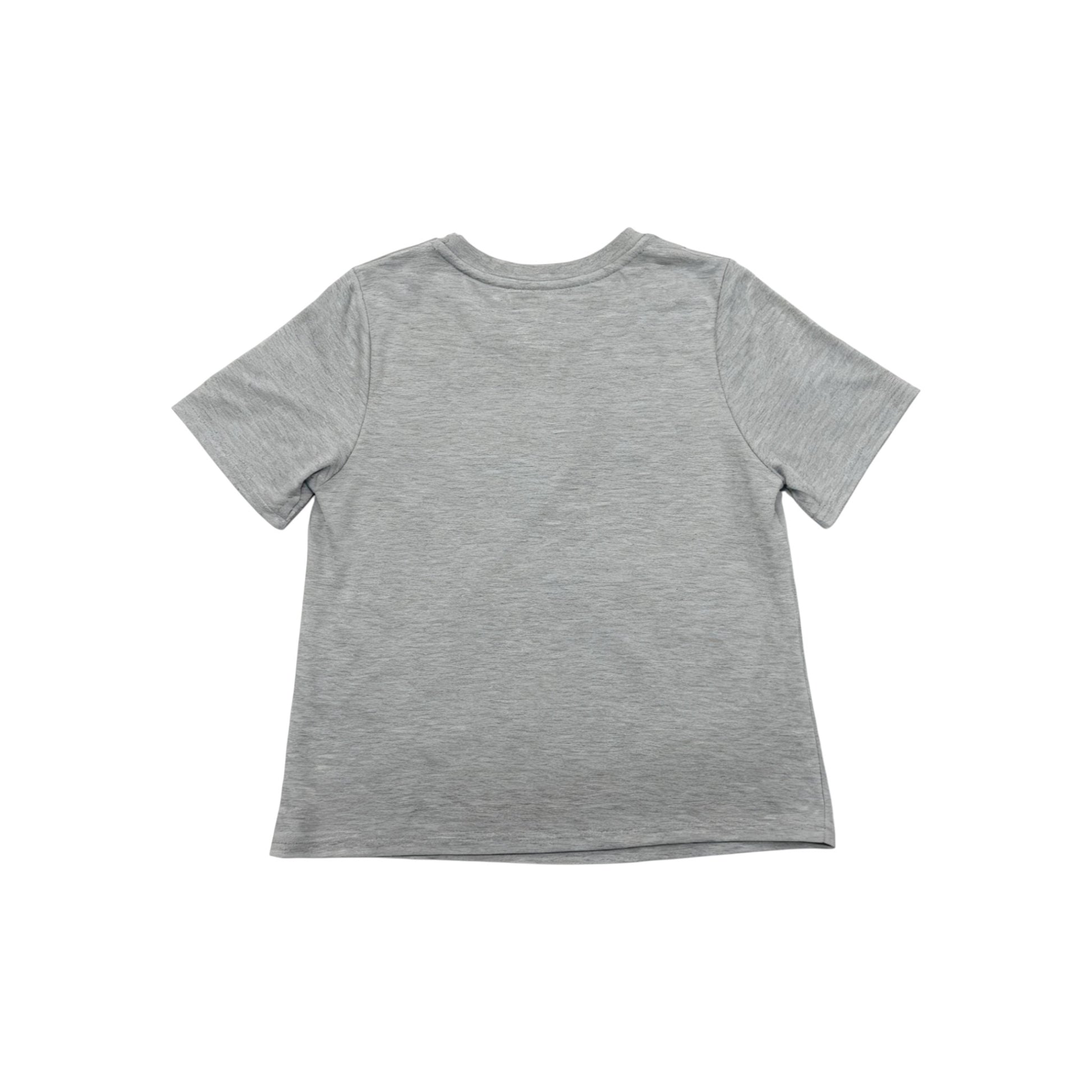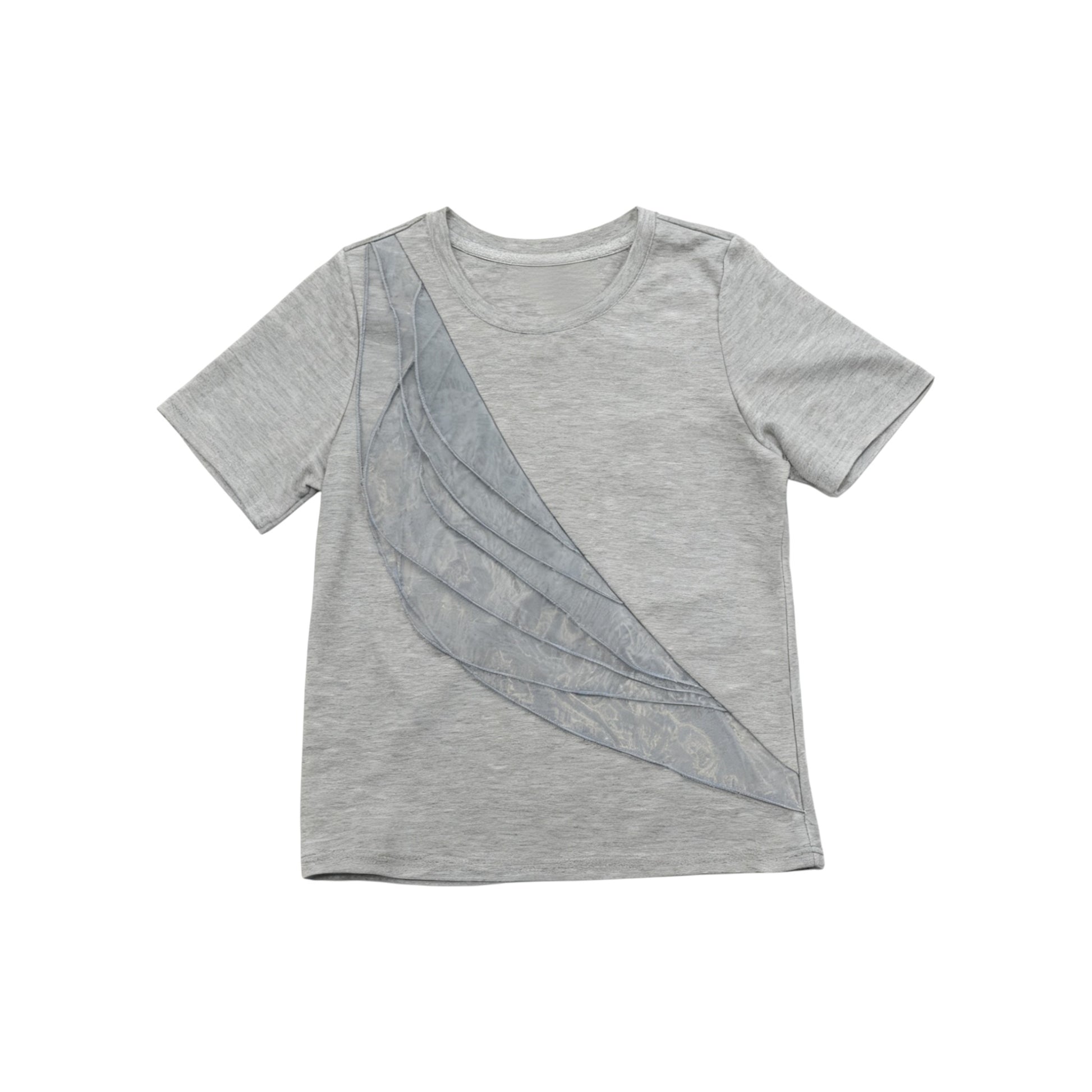 This grey short-sleeved top reimagines simplicity with a touch of sculptural elegance. Made from a smooth, slightly stretchy knit fabric, it offers a soft handfeel and a clean silhouette that flatters without clinging. The classic crew neckline and straight hem provide a timeless foundation.
