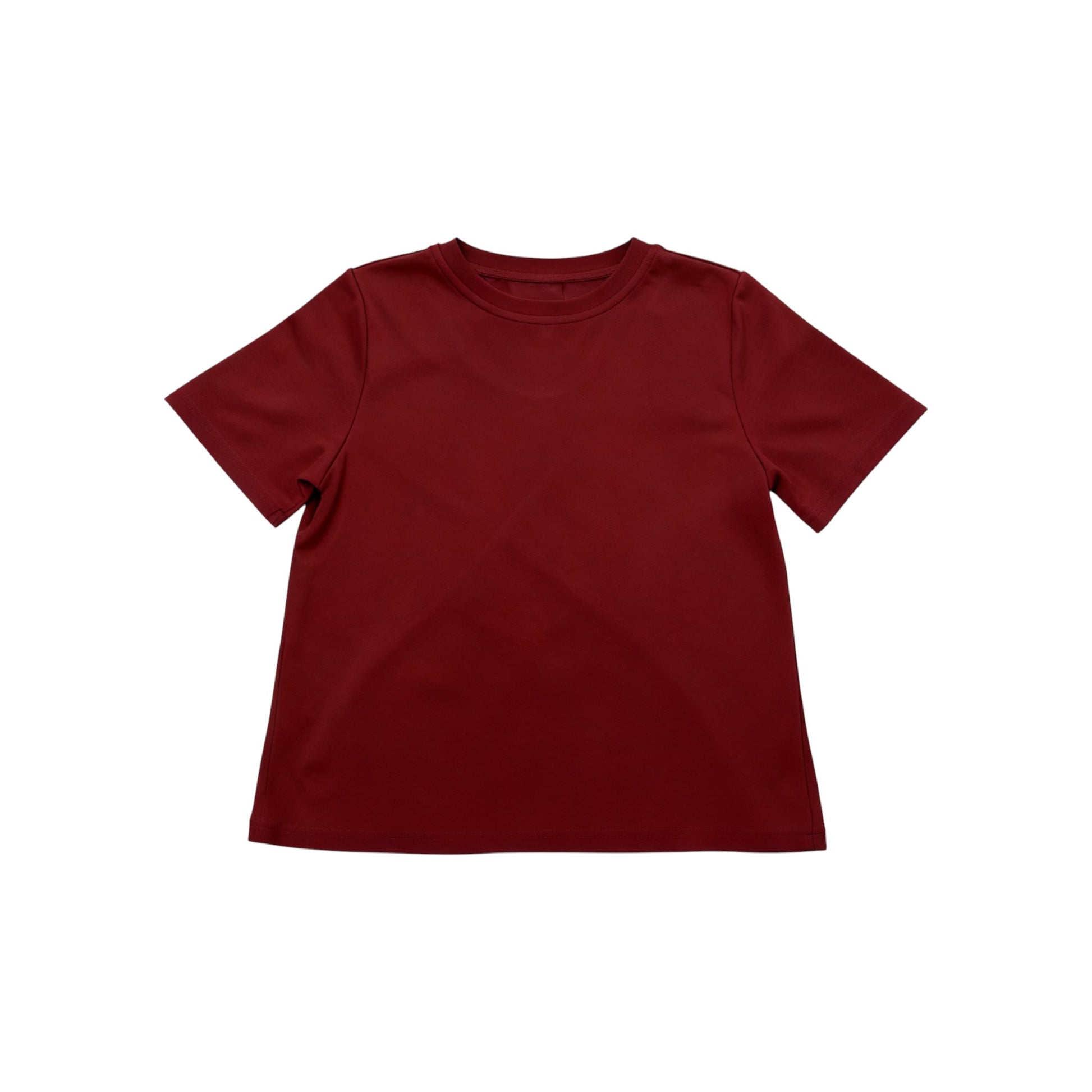 This maroon short-sleeved top reimagines simplicity with a touch of sculptural elegance. Made from a smooth, slightly stretchy knit fabric, it offers a soft handfeel and a clean silhouette that flatters without clinging. The classic crew neckline and straight hem provide a timeless foundation.