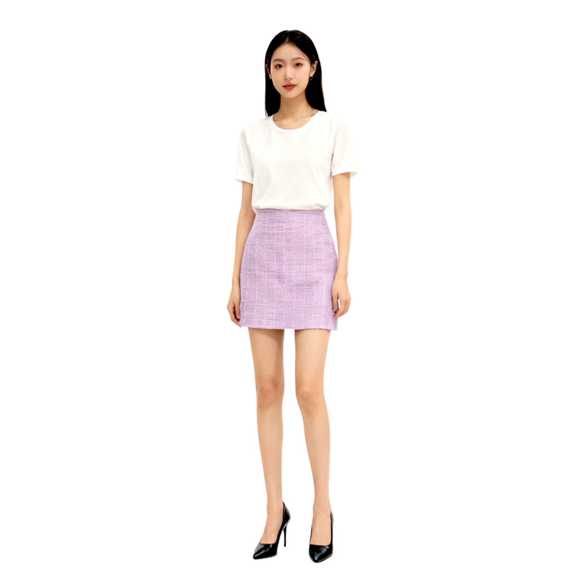 This lilac plaid mini skirt is a charming blend of structure and softness, perfect for adding a touch of elegance to everyday styling. Crafted from a textured woven fabric, the skirt features a subtle check pattern in white threads that create visual depth and a tactile finish. The fabric has a gentle stiffness that helps maintain the A-line silhouette while offering comfortable wear.