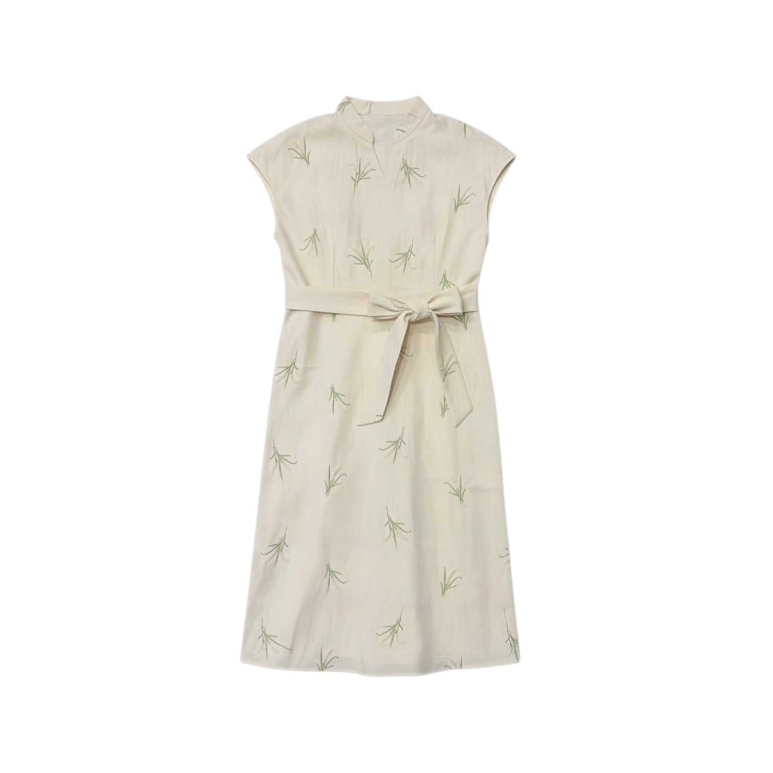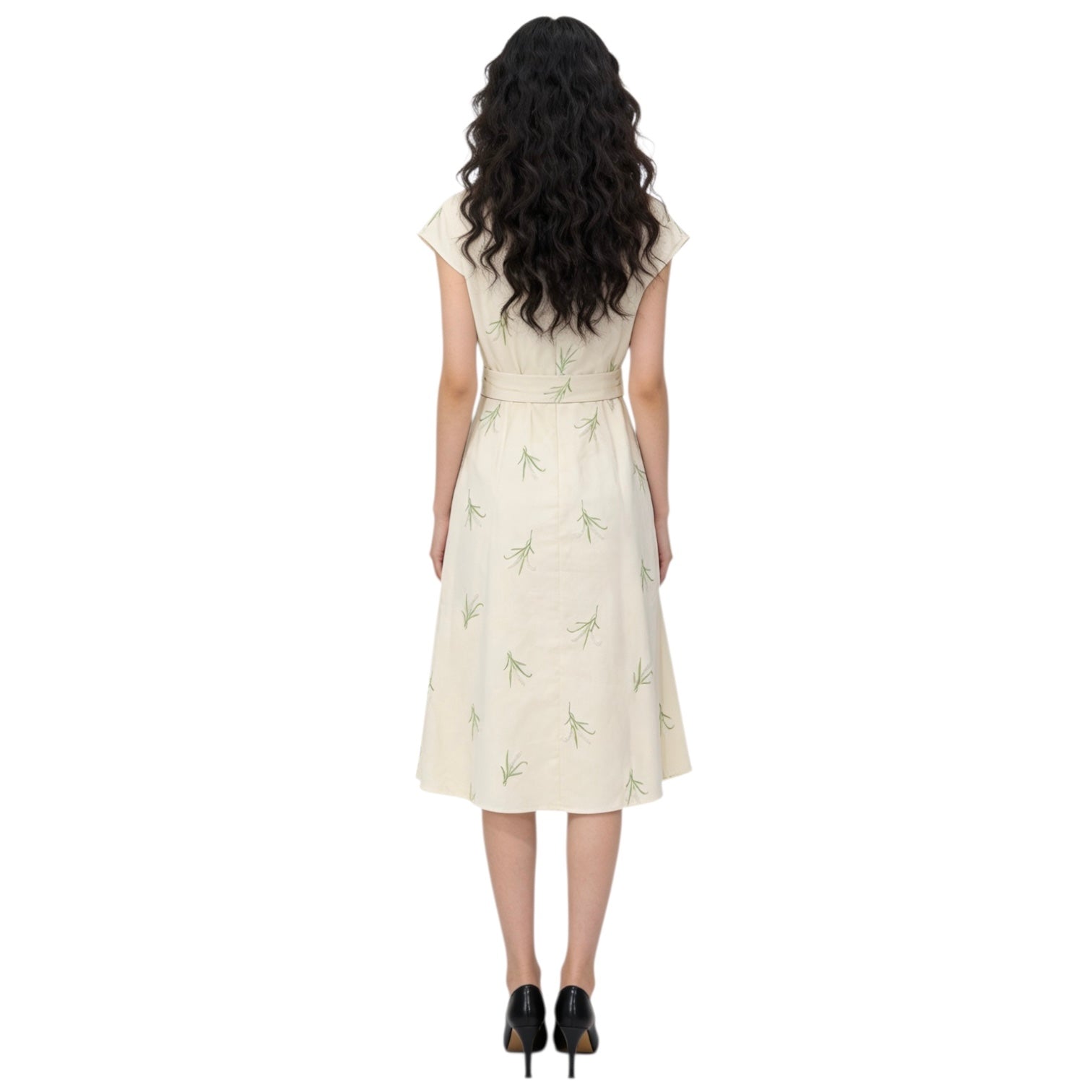 This cream-colored botanical print dress is a graceful blend of natural charm and tailored elegance. Crafted from a lightweight woven fabric with a smooth, breathable texture, it offers comfort and fluidity while maintaining a clean silhouette. The scattered green leaf motifs add a delicate touch, evoking freshness and subtle sophistication.