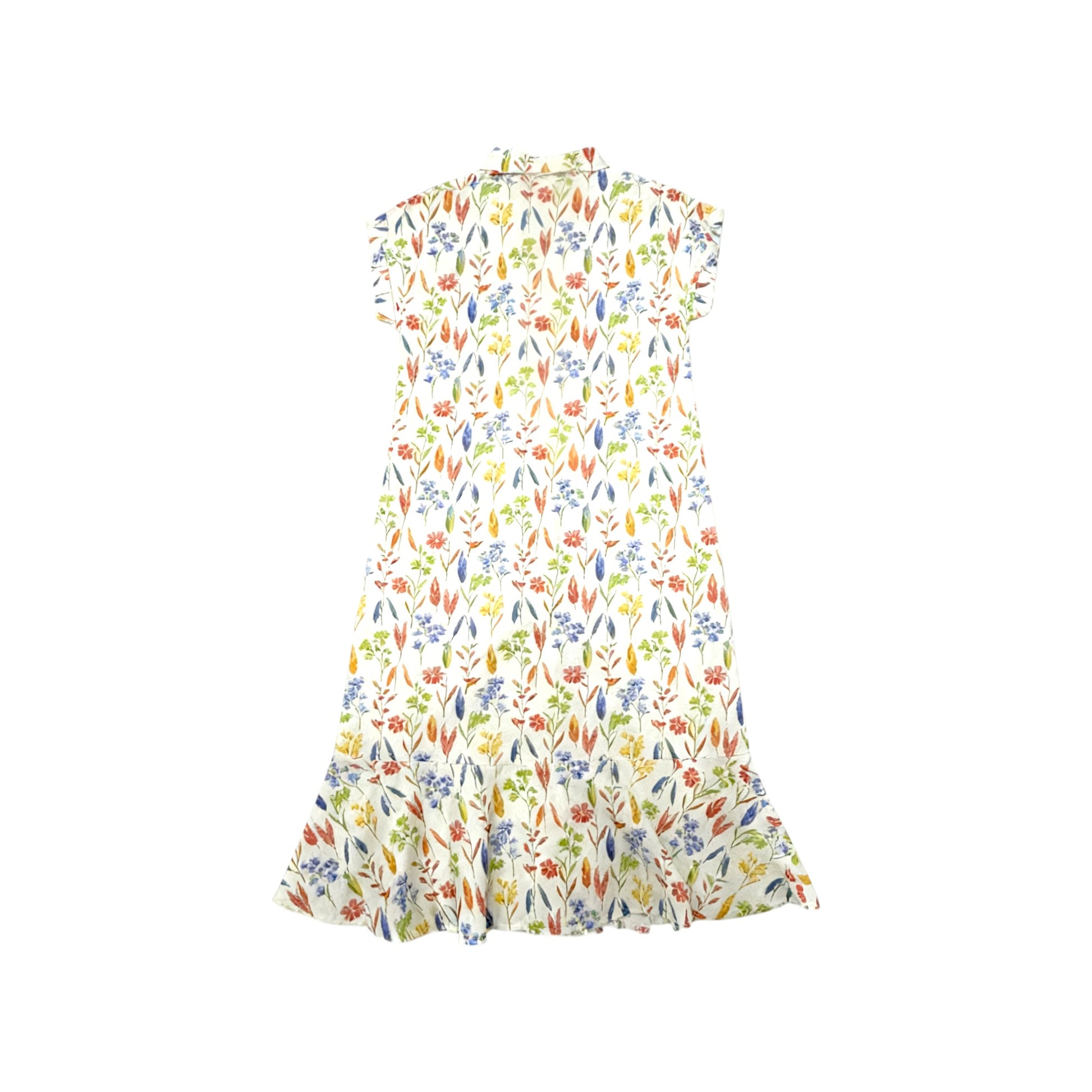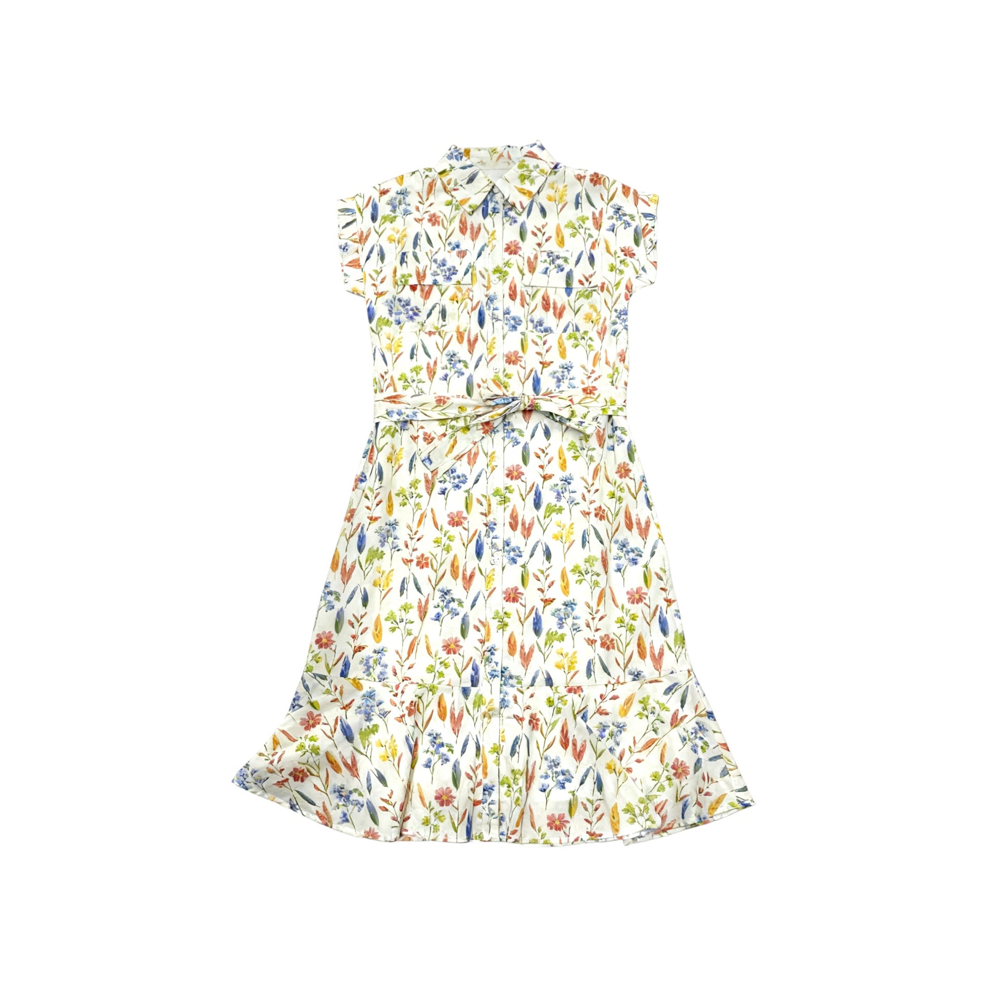 The dress is tailored with a classic shirt collar, short sleeves, and a full button-down front. A matching fabric belt cinches the waist, allowing for adjustable shaping and added definition. The flared hemline is finished with subtle ruffles, adding movement and a touch of romantic flair. Seam lines are clean and precise, ensuring a refined fit from every angle.