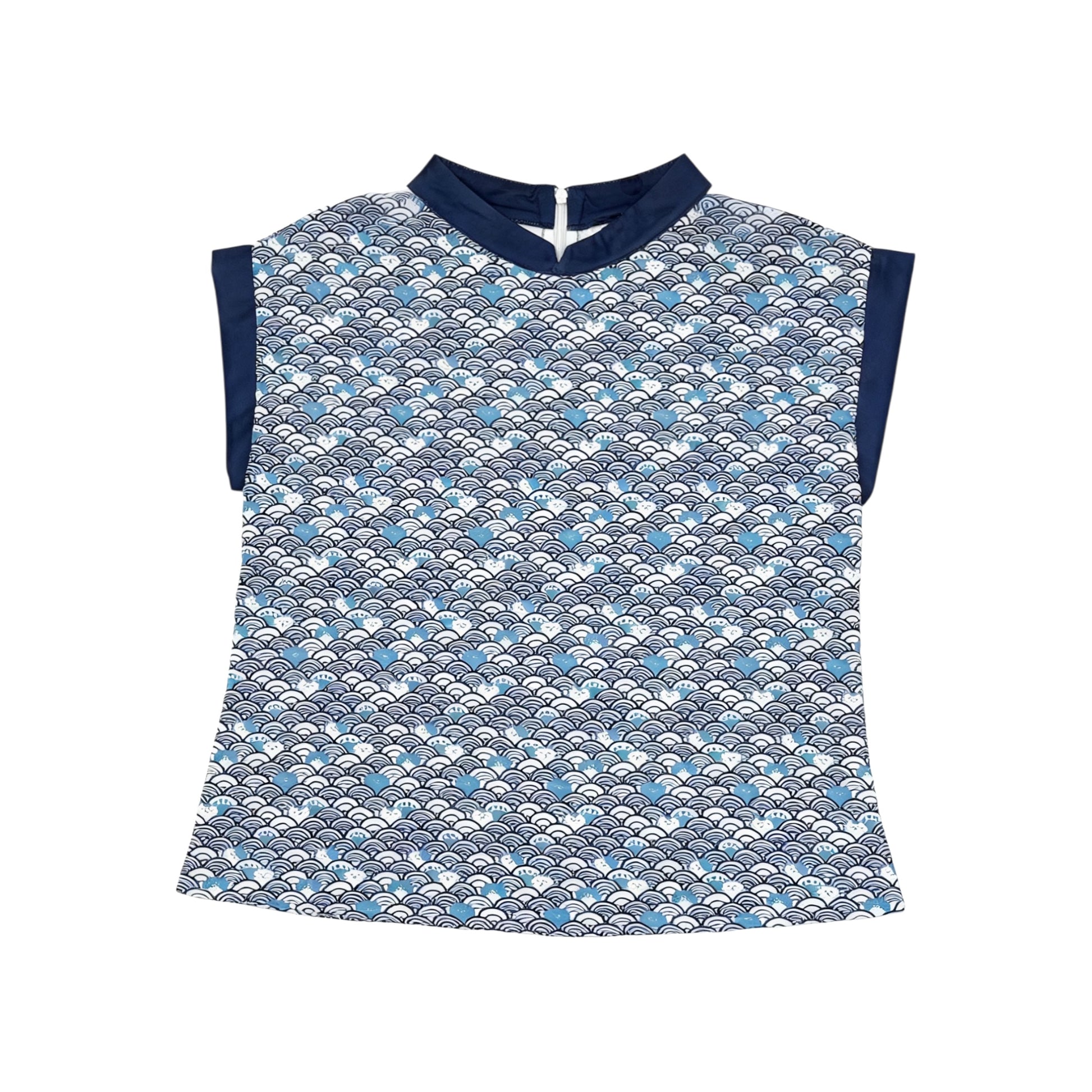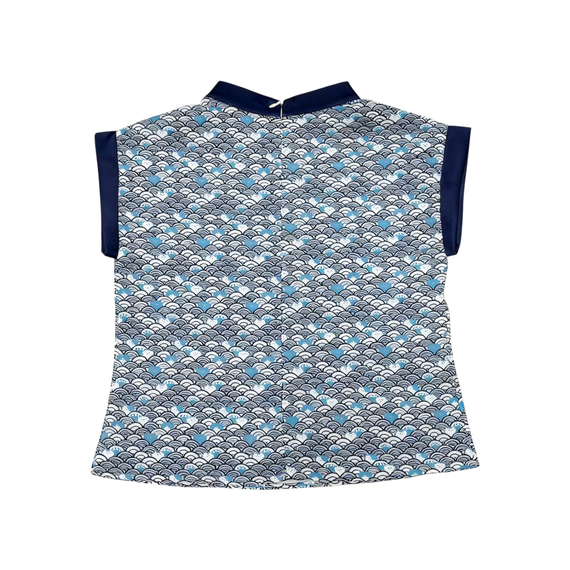 This short-sleeved top is a refreshing blend of tradition and modern flair. The main fabric features a wave-like pattern in shades of blue and white, cat cartoon print reminiscent of Japanese Seigaiha motifs, giving the piece a rhythmic, textured visual appeal. The material appears lightweight and breathable, with a subtle quilted texture that adds depth and structure.The collar and sleeve cuffs are crafted from solid dark blue fabric, providing a crisp contrast to the patterned body. This thoughtful color-blocking enhances the silhouette and lends a polished finish.
