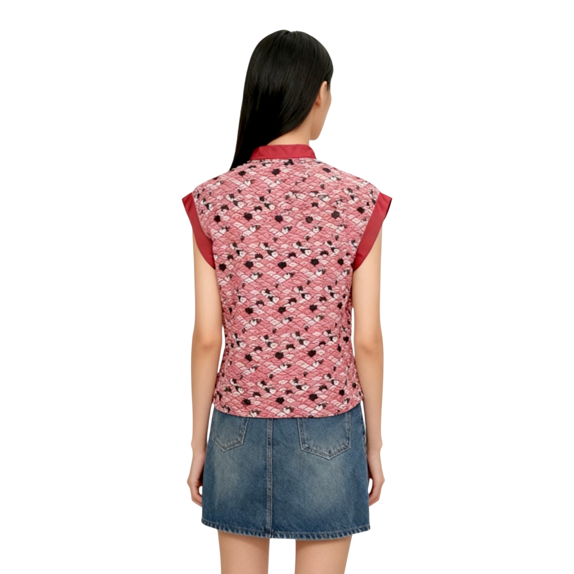 This short-sleeved top is a refreshing blend of tradition and modern flair. The main fabric features a wave-like pattern in shades of blue and white, cat cartoon print reminiscent of Japanese Seigaiha motifs, giving the piece a rhythmic, textured visual appeal. The material appears lightweight and breathable, with a subtle quilted texture that adds depth and structure.The collar and sleeve cuffs are crafted from solid dark blue fabric, providing a crisp contrast to the patterned body. This thoughtful color-blocking enhances the silhouette and lends a polished finish.