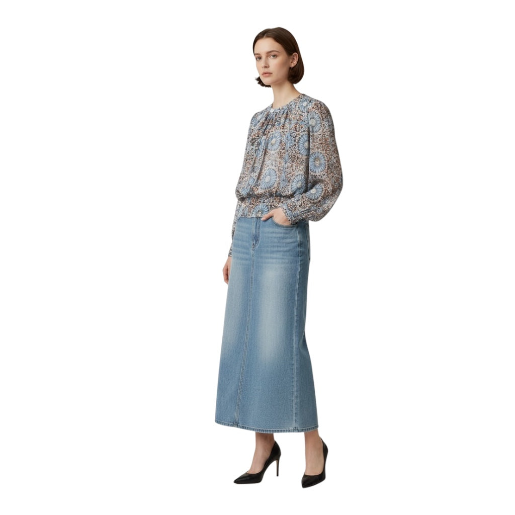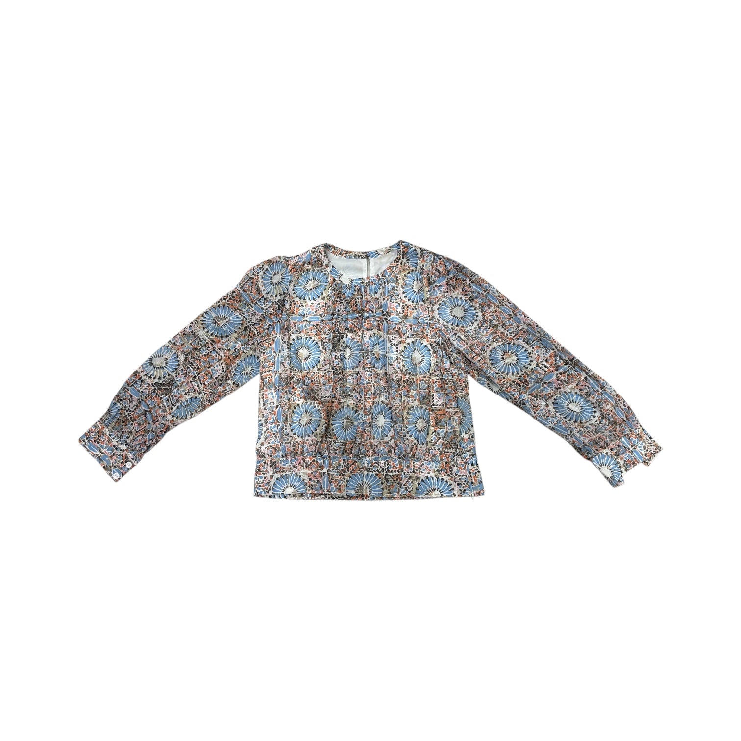 This long-sleeved floral blouse is a radiant statement piece that blends cheerful color with elegant detailing. Crafted from a lightweight woven fabric, it offers a smooth, breathable texture with a soft drape—ideal for warm climates and layered styling. The vibrant yellow base is adorned with white and black floral motifs, creating a lively yet refined visual rhythm.