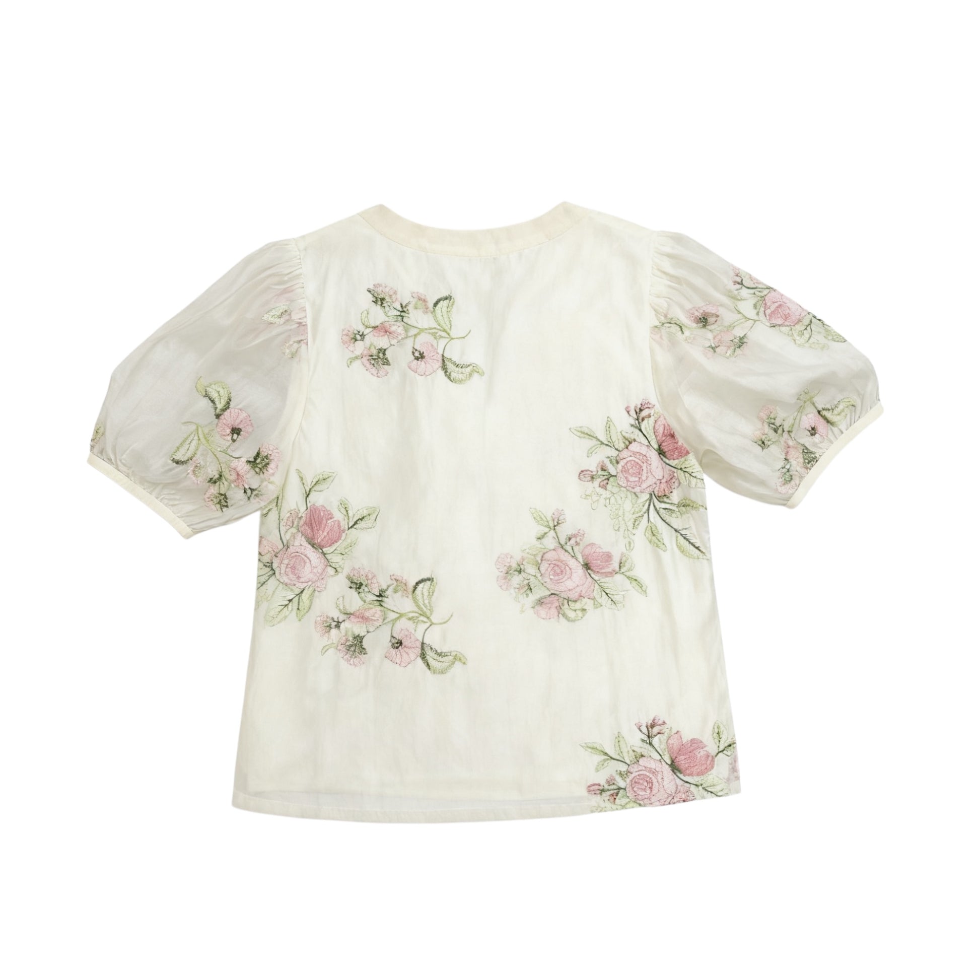 White short-sleeved blouse is crafted from lightweight, breathable fabric with a soft touch. Made from a lightweight semi-sheer fabric, this white blouse features puffed sleeves and romantic rose embroidery across the back and sleeves.The puffed sleeves add a vintage charm, while the delicate pink floral embroidery with green leaves on the chest and sleeves creates a soft, feminine look. The round neckline and small front buttons complete the fresh and elegant style, ideal for everyday wear or semi-formal occasions.