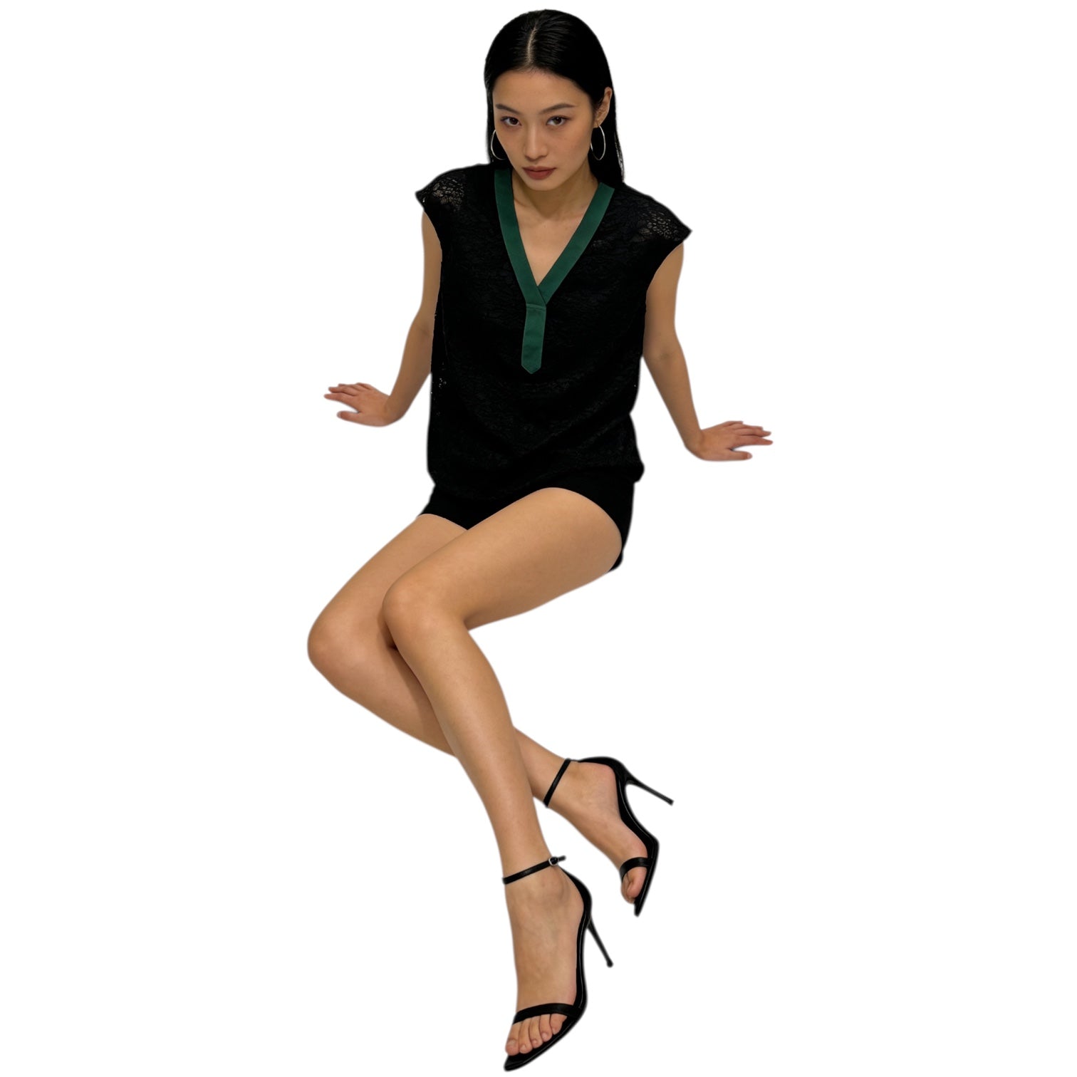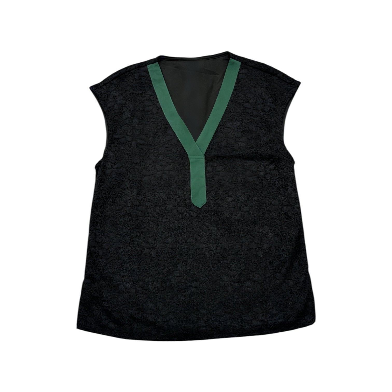 The deep V-neckline is accentuated with a bold green trim, creating a sharp contrast against the black base and drawing attention to the neckline as a focal point. The armholes are cleanly finished, and the seams are precise, ensuring a neat fit with a relaxed drape. The overall cut is slightly loose, balancing elegance with comfort, making it versatile for both casual and semi-formal styling.