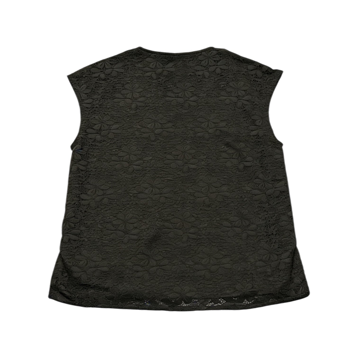 This sleeveless black blouse is a striking fusion of texture and modern contrast. Crafted from a lightweight lace-inspired woven fabric, it features a subtle floral pattern that adds depth and visual interest. The fabric is soft yet structured, offering breathability while maintaining a polished silhouette.