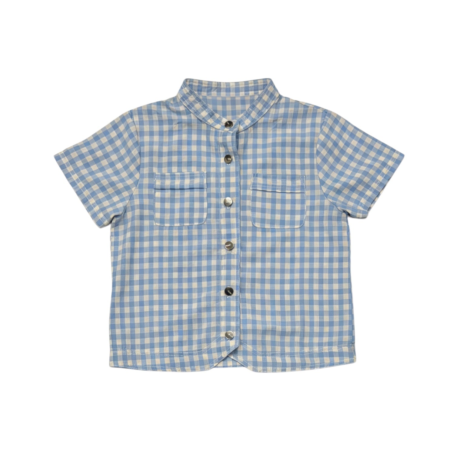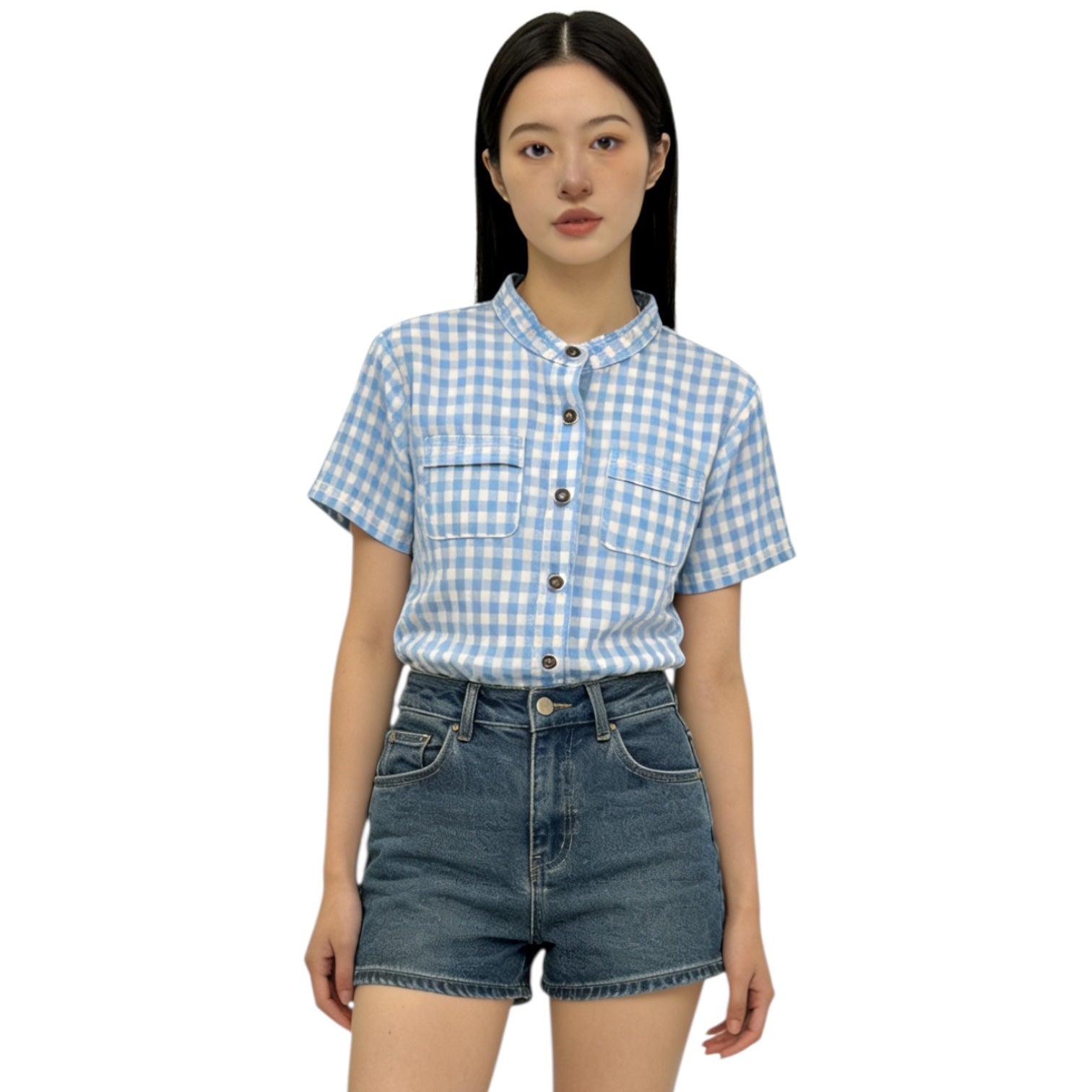A light blue and white checkered short-sleeve button-up shirt with a mandarin collar. Two front chest pockets add both functionality and style. The relaxed cut makes it ideal for warm-weather wear.The shirt is crafted from breathable cotton or blended fabric for comfort, while the shorts are made of durable denim to ensure longevity and shape.