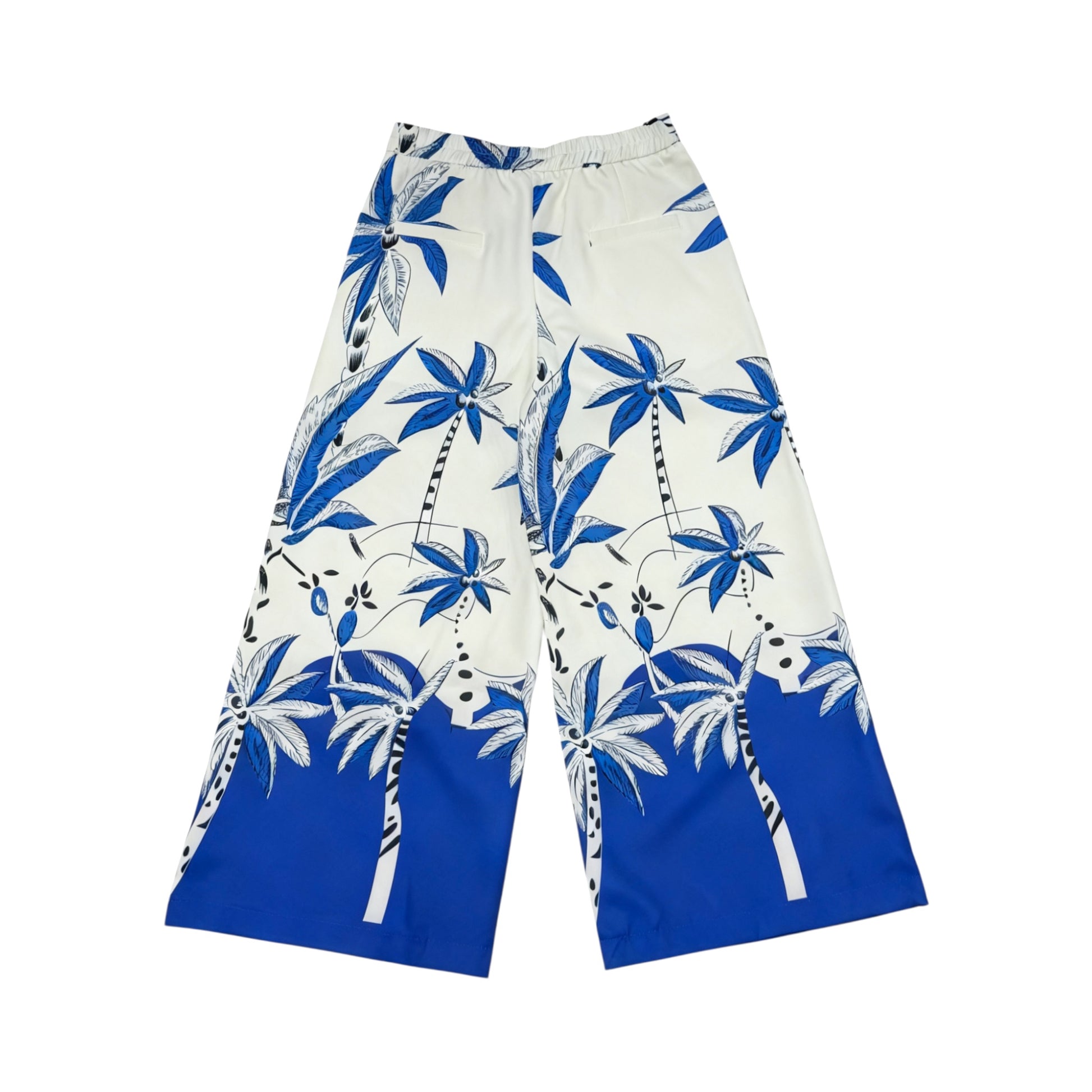 This collection features bold tropical palm prints with gradient color blocking and high-contrast designs. Sleeveless tops paired with wide-leg pants create a sleek, breezy silhouette perfect for warm weather. The fabric is lightweight and smooth with excellent breathability, ensuring comfort and style. With vibrant hues like blue, white, and black, these pieces are ideal for vacations, beach outings, or urban summer looks.Elastic waistband for comfort and flexibility