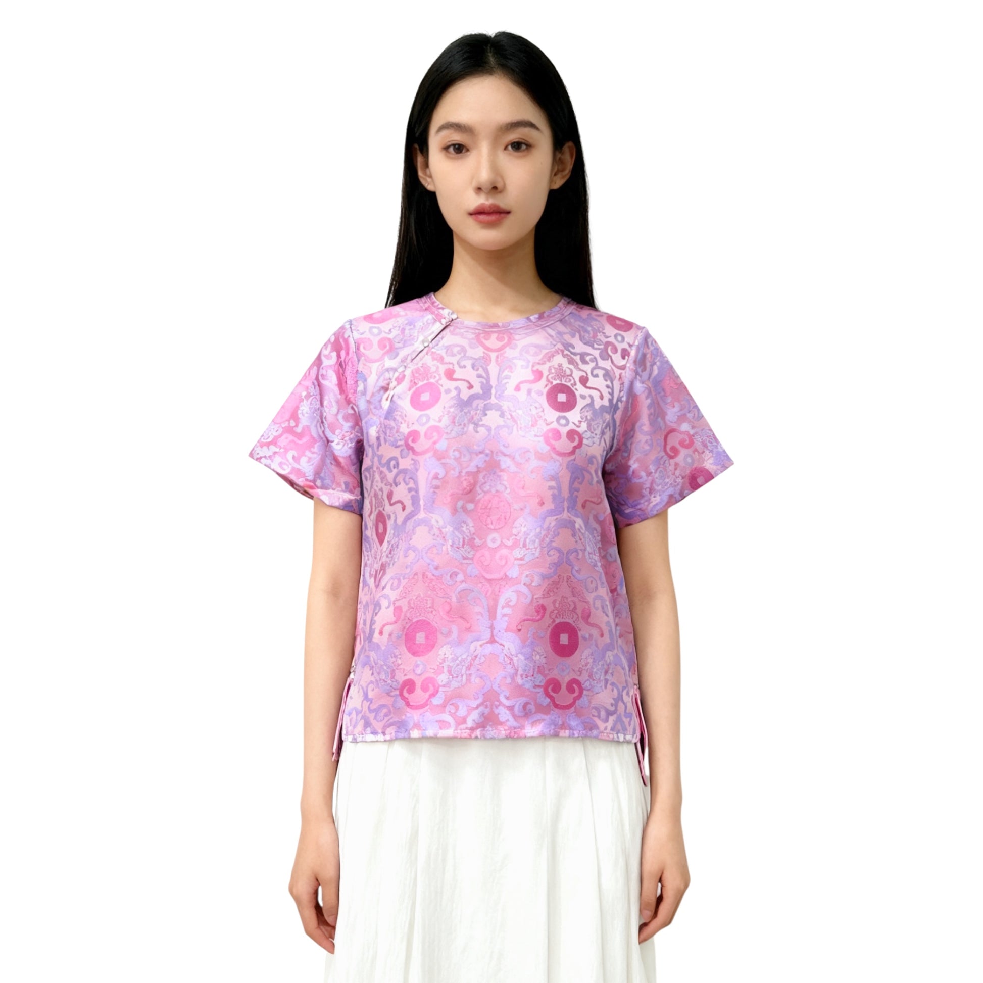 This short-sleeved top radiates warmth and cultural richness through its vibrant palette and intricate pattern. The fabric features a swirling mix of floral and abstract motifs in purple, pink, and soft pastel tones, reminiscent of traditional Asian textile art. Made from a lightweight woven material, it offers a smooth texture with a gentle sheen.The round neckline is clean and classic, while the hemline includes subtle side slits tied with matching fabric strings, adding a playful and functional detail. A small decorative clasp or button near the collar adds a refined touch. The symmetrical layout of the print enhances visual harmony, while the saturated colors bring energy and personality to the silhouette.This piece is perfect for festive occasions, cultural events, or simply adding a bold statement to everyday wear.